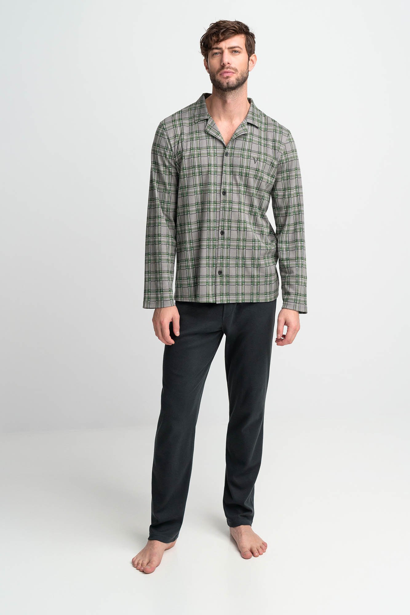 Pohodlné dvoudílné pánské pyžamo pro kvalitní spánek a volný čas. Komplet sestává z klasického celopropínacího trika s dlouhým rukávem a výstřihem do V, který doplňují dlouhé kalhoty rovného střihu s pohodlnou gumou v pase. Toto pánské pyžamo je vyrobené z vysoce kvalitní, genetický nemodifikované řecké bavlny, která poskytuje vysoké pohodlí, příjemný pocit na dotek, prodyšnost, pružnost a odolnost. Úplet interlock přispívá k tomu, že se tkanina nekrčí, je odolná, pevná a hřejivá.