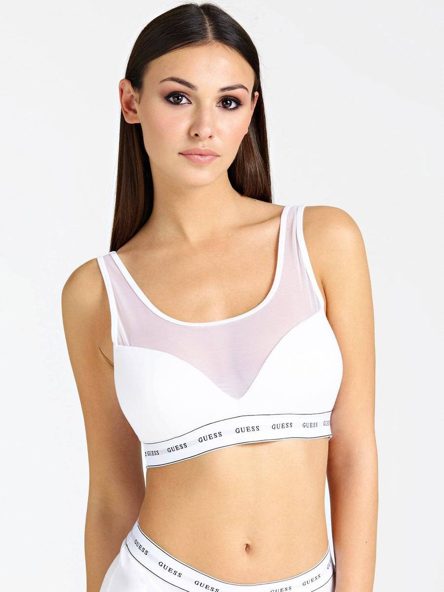 Bralettka z nové kolekce Guess s vyztuženými košíčky a originálním designem žerzeje ve výstřihu.