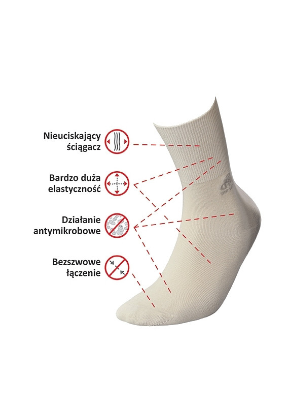 Zdravotní ponožky JJW Deo Med/Bamboo z bambusové příze. Díky speciální konstrukci nestahují. Bezešvé spoje nad prsty garantují maximální komfort. Ponožky zabraňují vzniku mikrobů a tím vzniku zápachu během nošení. Jsou vhodné pro osoby s citlivými chodily.