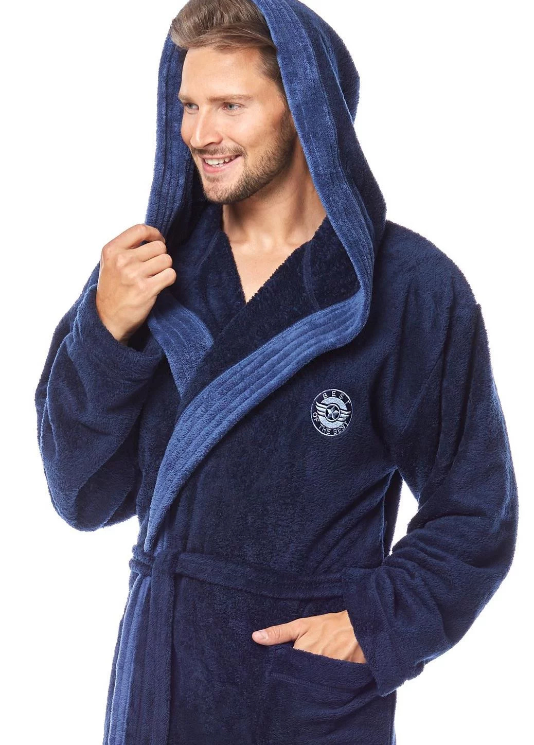 Zajímavý jednoduchý župan s kapucí v tmavě modré barvě. Dobře sedí, v pase se zavazuje a na bocích má dvě kapsy. Zajímavý nádech mu dodává lemování v kontrastní barvě. Vrchní záplata. Polský výrobek, vysoká kvalita. Složení: 100% polyester.