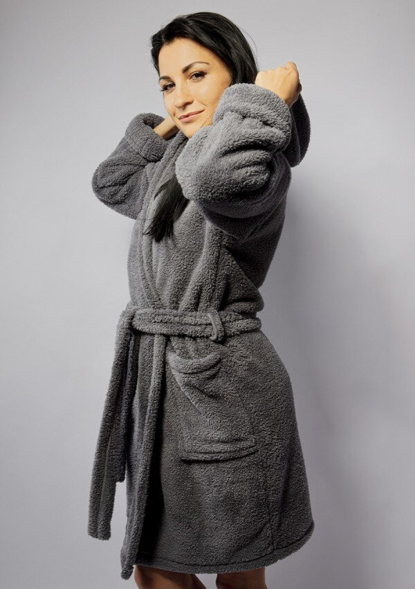 Dámský hunatý župan s kapucí je hřejivý a velmi příjemný na dotek. Je tvořen delším vlasem po obouch stranách, zavazuje se na pásek připevněný poutky.